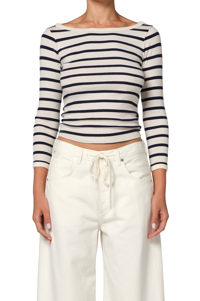 • U-Boot-Ausschnitt mit weißen und marineblauen Streifen